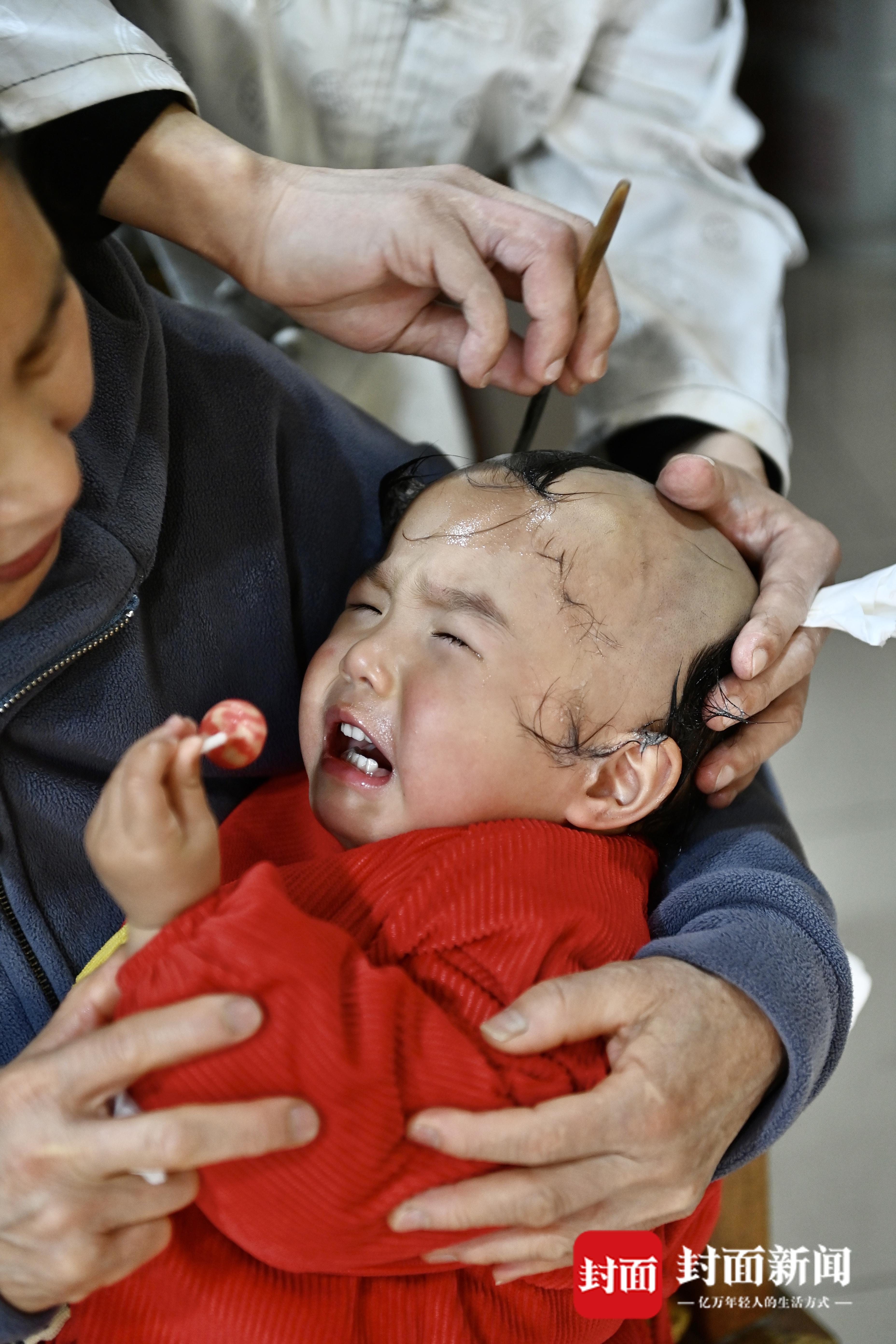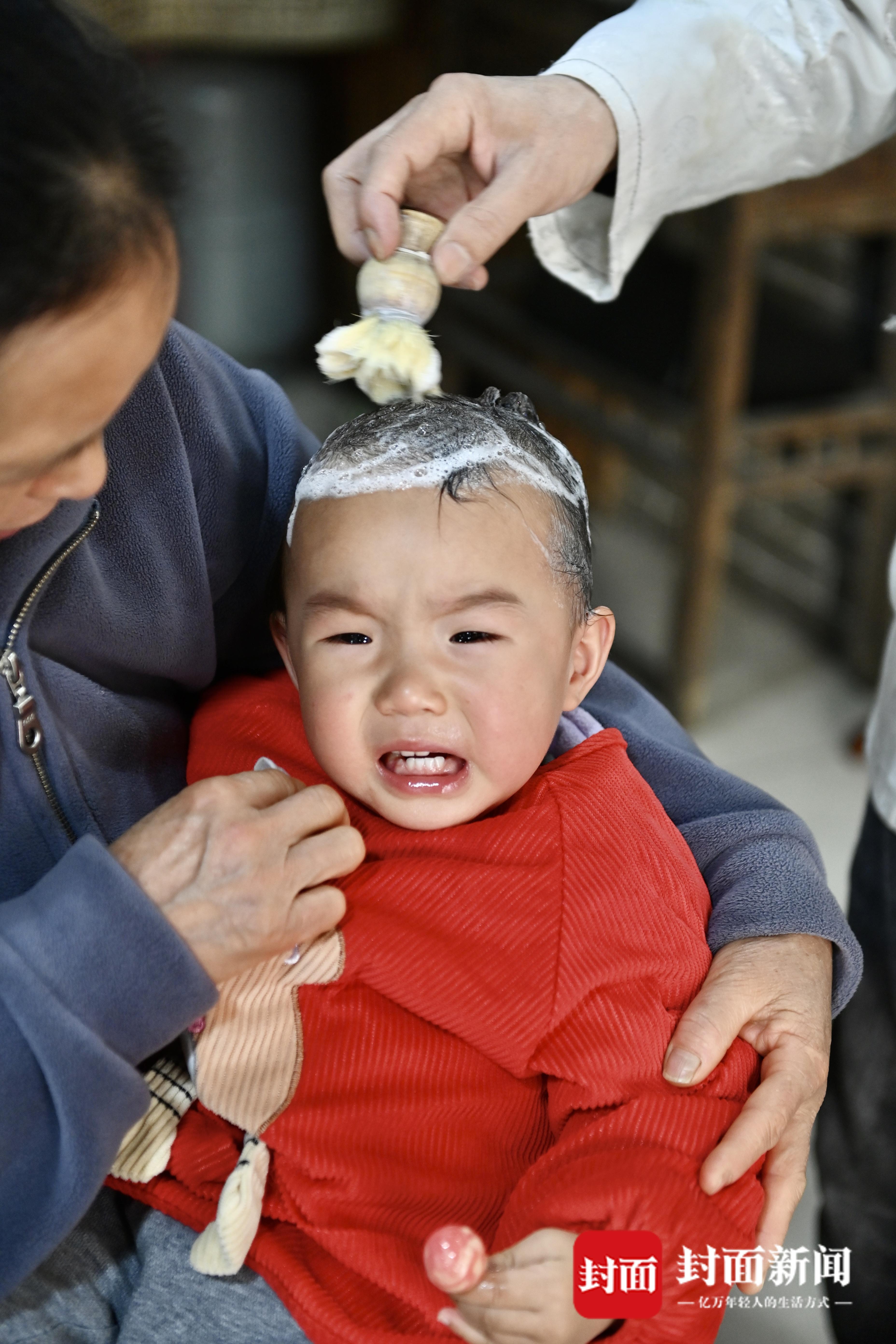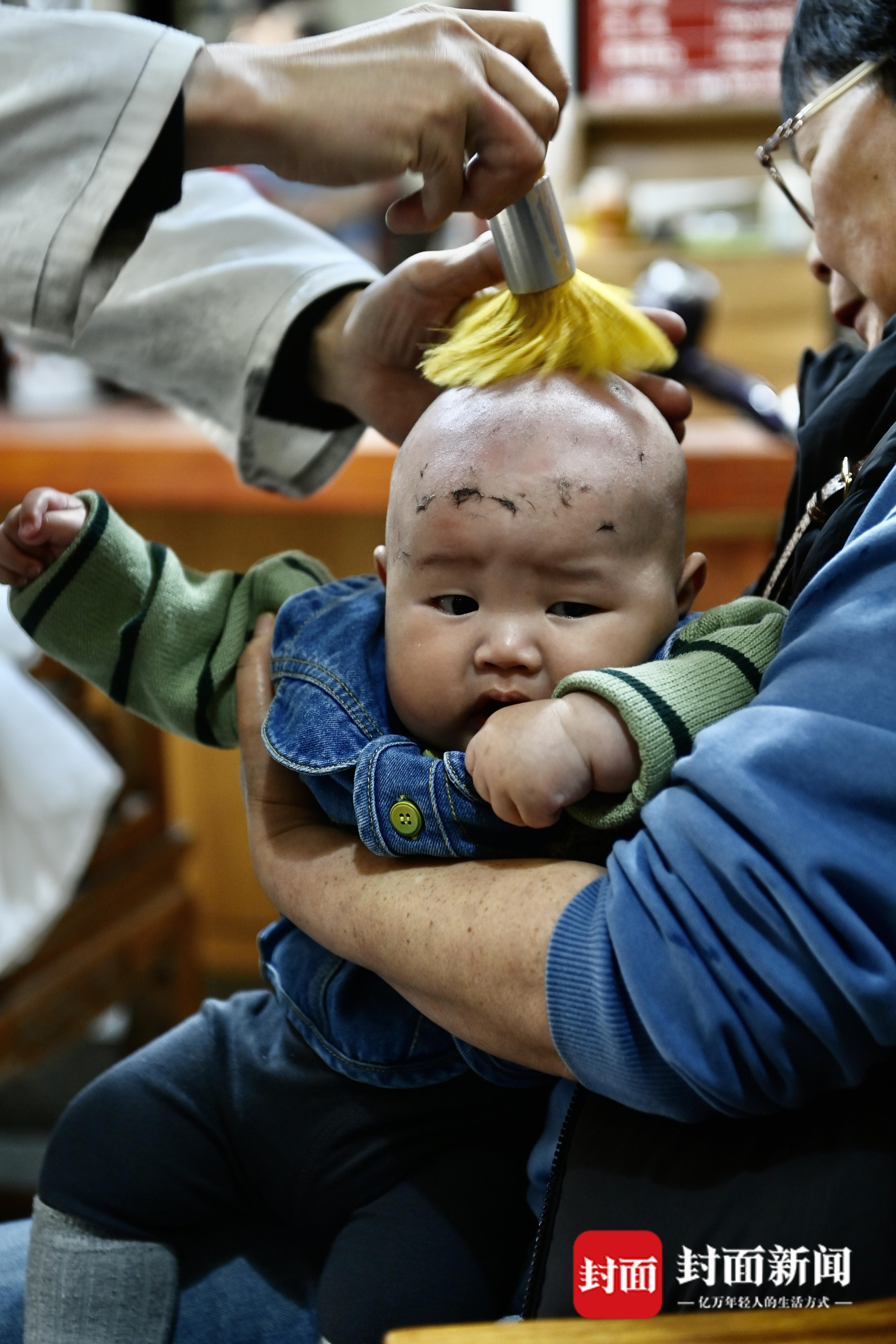 农历二月初二,宝娃在理发店“剃喜头”。