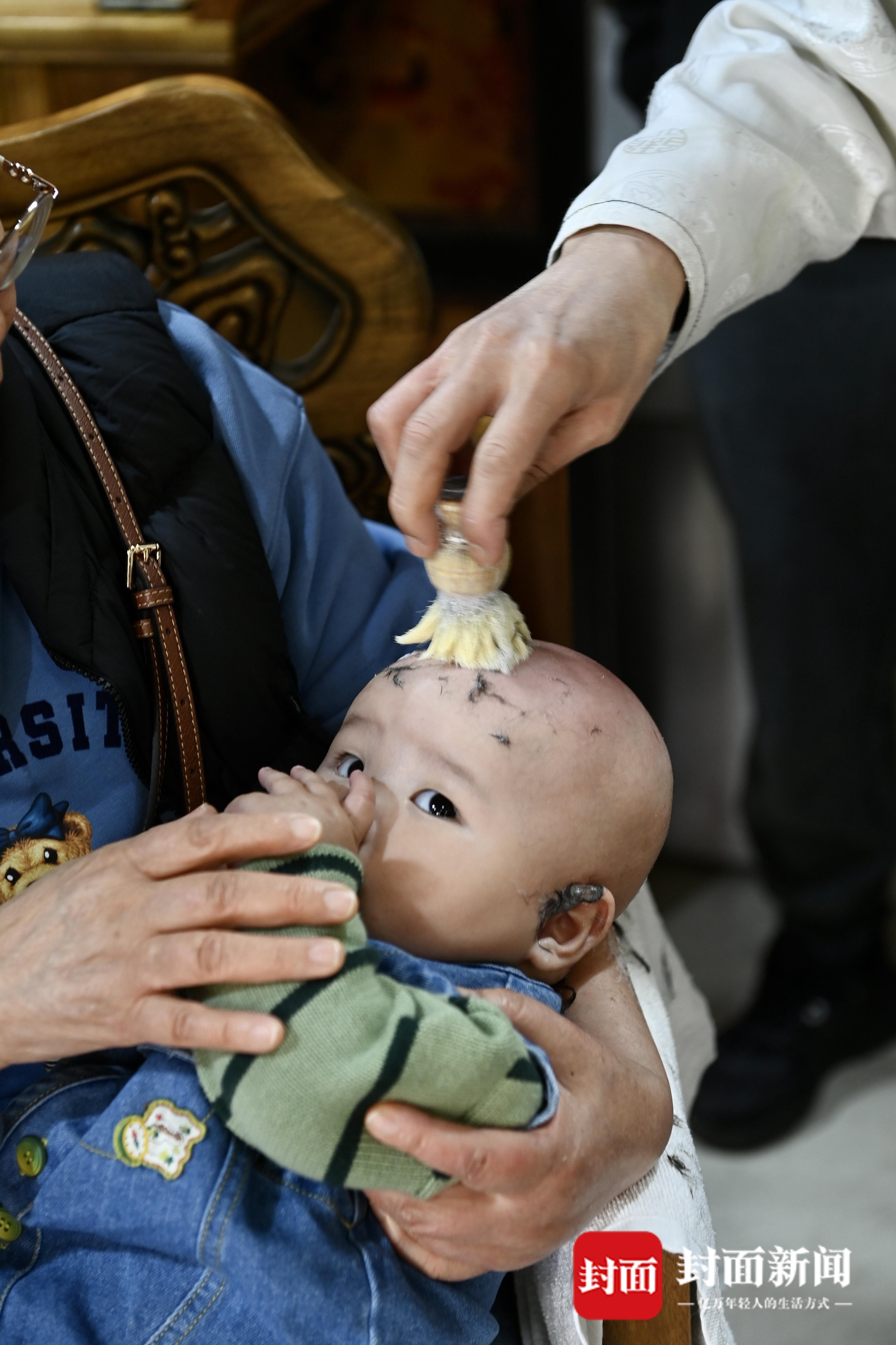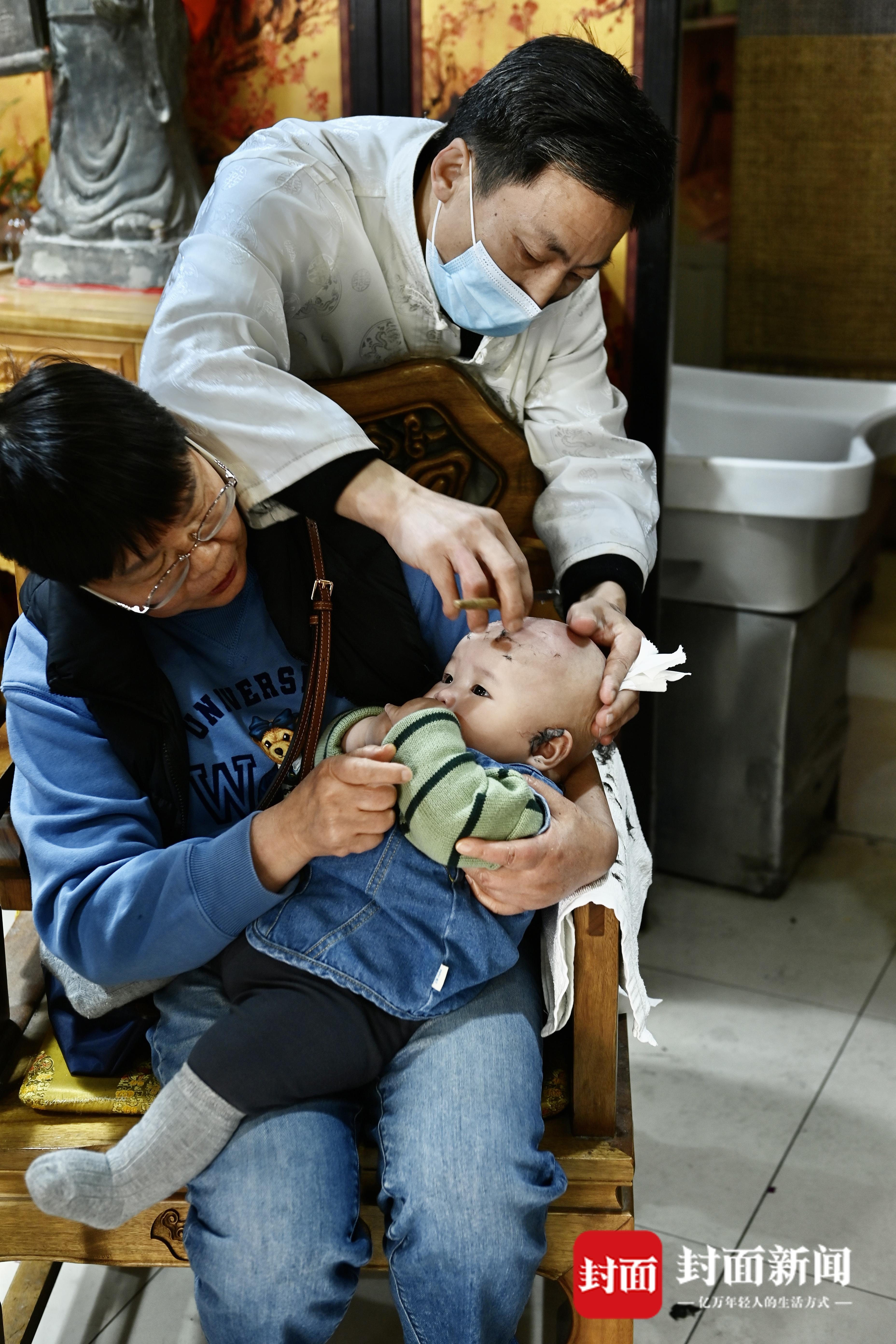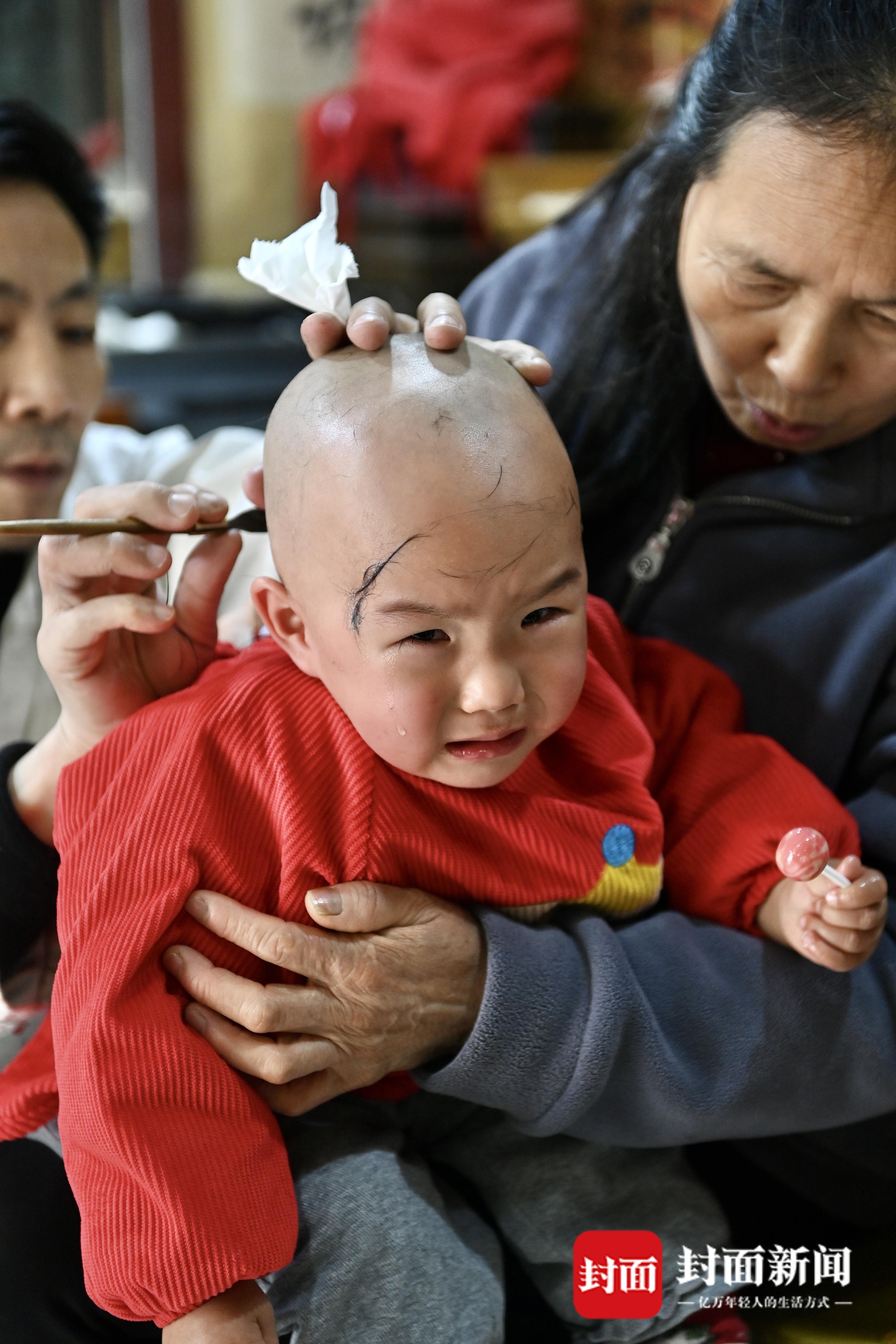农历二月初二,宝娃在理发店“剃喜头”。